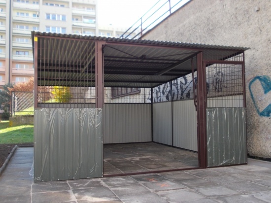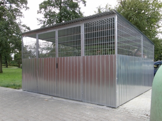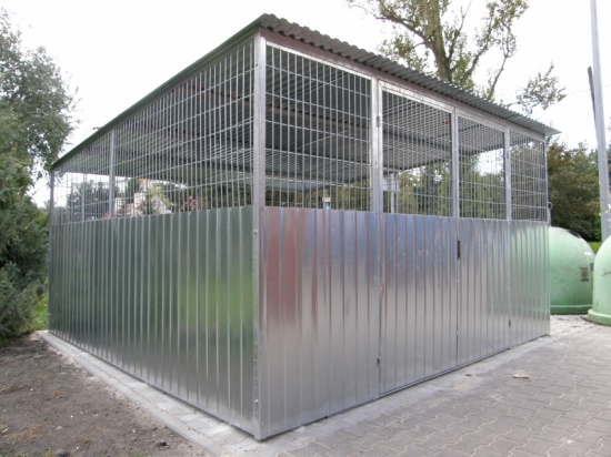 Wiata śmietnikowa wykonana z kątownika zimno giętego poddanego metodzie ocynkowania ogniowego, obłożona blachą ocynkowaną z nadstawkami górnymi z siatki własnej produkcji o przekroju oczka 15 cm x 5 cm (umożliwia filtrację powietrza).