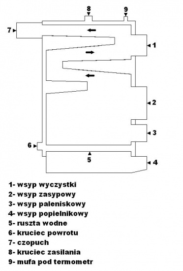 - kanały dymne są umieszczone nad paleniskiem co zwiększa żywotność kotła i jednocześnie